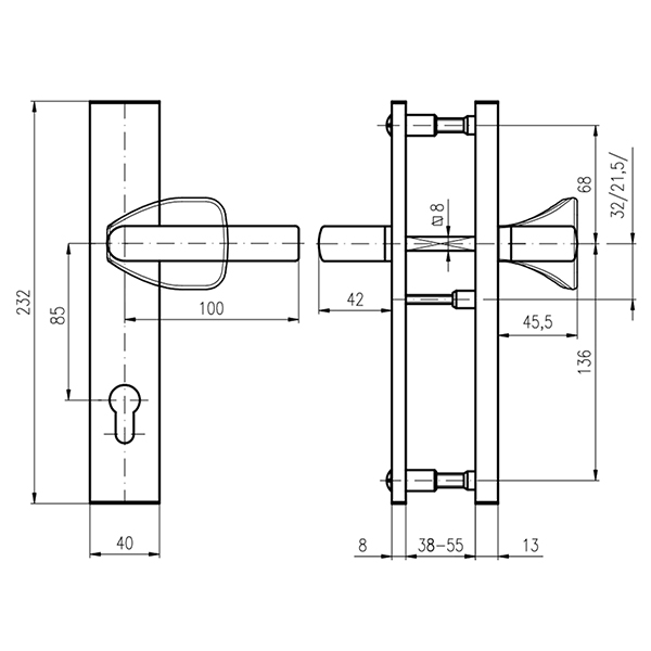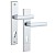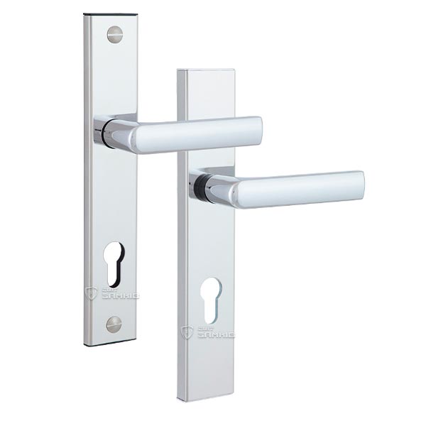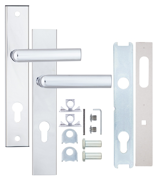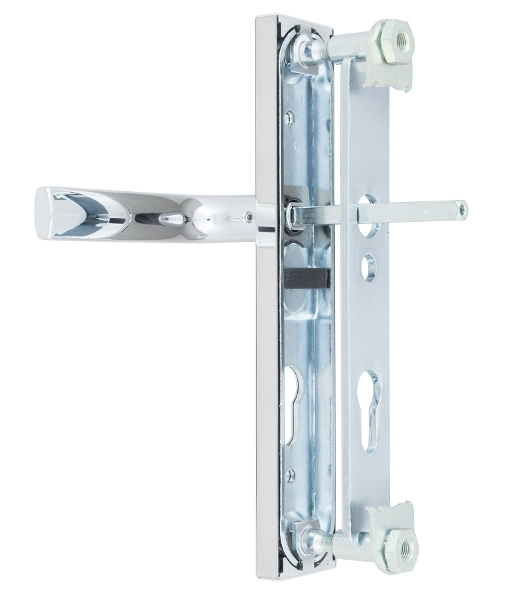 Захисні ручки на планці чеського виробництва ROSTEX. Представляє собою практичну дверну фурнітуру з високим рівнем захисту. Ручки та планки виготовляються із нержавіючої сталі, а декоративна плата, яка накладається на планку, виготовляється із цинкового сплаву. Монтується ця модель на два стяжні гвинти М8, завдяки чому ручки міцно закріплюються на планці і мають захист від вандального зламу. Все це робить дану фурнітуру стійкою до виламування та інших силових методів. Ця модель оснащена зручною нажимною частиною з металевим пружиним механізмом, завдяки чому ручки не будуть провисати та розхитуватись. Сучасний мінімалістичний дизайн гармонійно доповнить дверне полотно з прямими лініями або скляними вставками. Яскравий колір – хром полірований – чудово підійде для офісного приміщення або квартири в світлих відтінках, а темному дверному полотну додасть трішки контрасту. Покриття методом гальваніки гарантує надійний захист кольорового відтінку від стирання до 120 місяців. При виборі зверніть увагу, що такі ручки підходять лише для механізму замка з міжосьовою відстанню 85 мм. За необхідності монтажу фурнітури на товстіші двері рекомендуємо придбати відповідний подовжуючий набір.