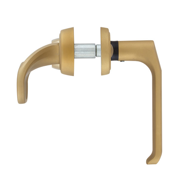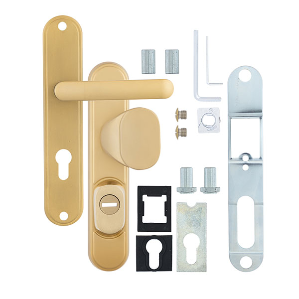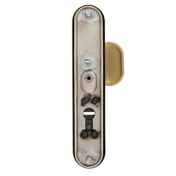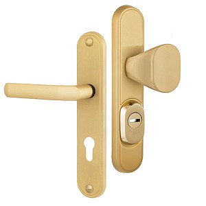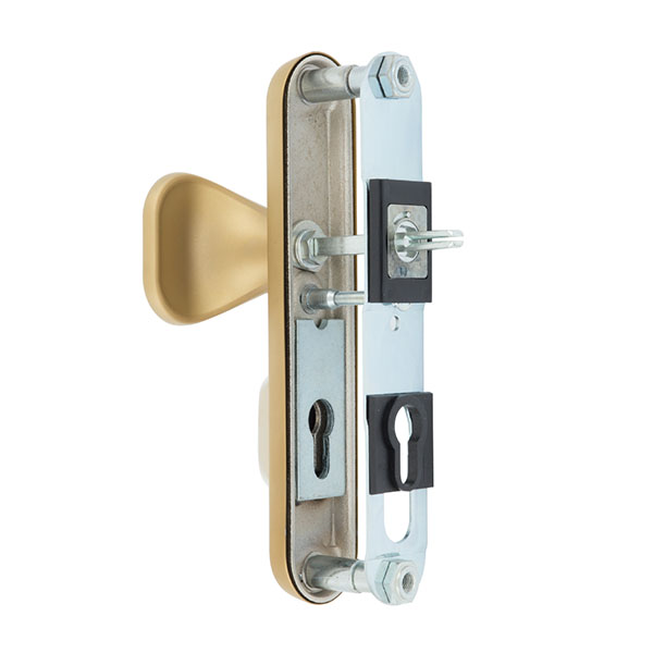 Зламостійкі ручки на планці з протектором чеського виробництва ROSTEX. Якщо у Вас виникає потреба надійно захистити замок та серцевину, то ця модель зможе повністю задовільнити її. Ручки виготовляються із міцної нержавіючої сталі, планки в свою чергу виготовляються із цинкового сплаву. Ззовні планки не видно отворів для кріплення, вони знаходяться в середині і фіксуються за допомогою двох масивних гвинтів М8. Серцевина захищена протектором із гартованої сталі і шайбою з отвором під ключ з нержавіючої сталі. Завдяки цьому ця модель має високий рівень захисту від висвердлювання, виламування та інших силових методів зламу. Кольоровий відтінок захищений спеціальним методом гальваніки, що гарантує його стійкість до стирання протягом 120 місяців. Яскравий колір – титан PVD сатин – рекомендуємо поєднувати з інтер’єром в спокійних золотих відтінках. В цієї моделі тип ручок різний, з одного боку це звичайна нажимна, а з іншого фіксована. Зазвичай такі ручки використовують в приміщеннях з великим трафіком людей. Під час вибору зверніть увагу на міжосьову відстань ручок та Вашого механізму замка. Дані ручки підходять тільки для механізмів замка з міжосьової відстанню 72 мм. За необхідності монтажу фурнітури на товстіші двері рекомендуємо придбати відповідний подовжуючий набір.