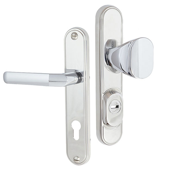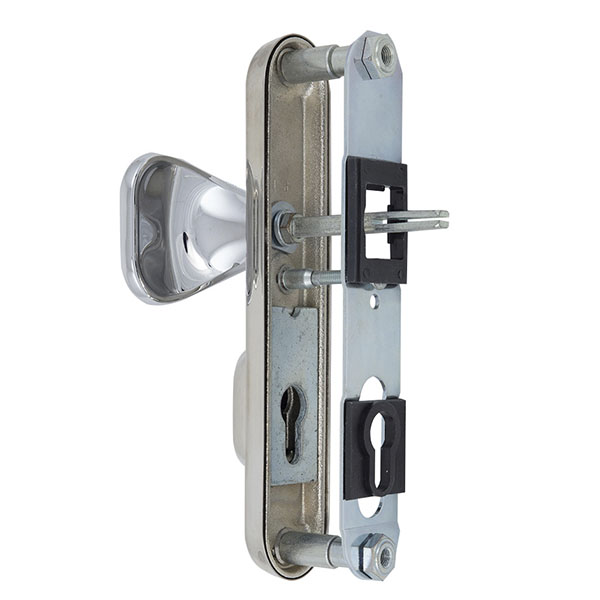 Зламостійкі ручки на планці з протектором чеського виробництва ROSTEX. Якщо у Вас виникає потреба надійно захистити замок та серцевину, то ця модель зможе повністю задовільнити її. Ручки виготовляються із міцної нержавіючої сталі, планки в свою чергу виготовляються із цинкового сплаву. Ззовні планки не видно отворів для кріплення, вони знаходяться в середині і фіксуються за допомогою двох масивних гвинтів М8. Серцевина захищена протектором із гартованої сталі і шайбою з отвором під ключ з нержавіючої сталі. Завдяки цьому ця модель має високий рівень захисту від висвердлювання, виламування та інших силових методів зламу. Кольоровий відтінок захищений спеціальним методом гальваніки, що гарантує його стійкість до стирання протягом 120 місяців. Популярний колір – хром матовий – чудово буде виглядати в приміщені чи кімнаті в сірих тонах. В цієї моделі тип ручок різний, з одного боку це звичайна нажимна, а з іншого фіксована. Зазвичай такі ручки використовують в приміщеннях з великим трафіком людей. Під час вибору зверніть увагу на міжосьову відстань ручок та Вашого механізму замка. Дані ручки підходять тільки для механізмів замка з міжосьової відстанню 85 мм. За необхідності монтажу фурнітури на товстіші двері рекомендуємо придбати відповідний подовжуючий набір.
