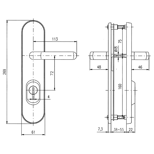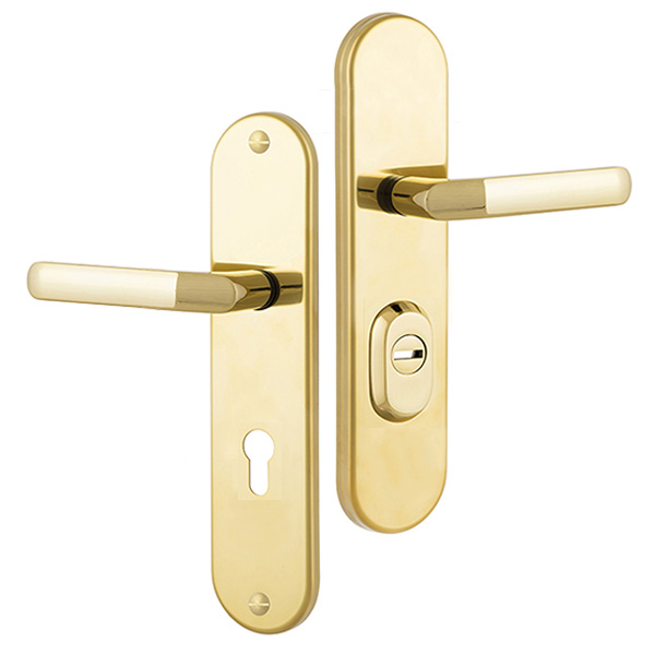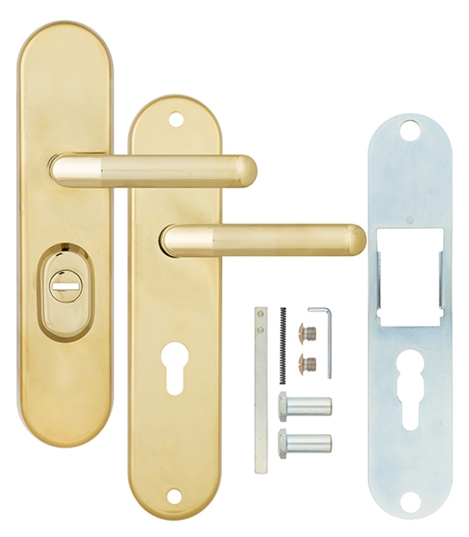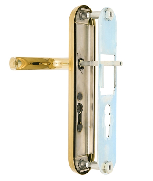 Зламостійкі ручки на планці з протектором чеського виробництва ROSTEX. Якщо у Вас виникає потреба надійно захистити замок та серцевину, то ця модель зможе повністю задовільнити її. Ручки виготовляються із міцної нержавіючої сталі, планки в свою чергу виготовляються із цинкового сплаву. Ззовні планки не видно отворів для кріплення, вони знаходяться в середині і фіксуються за допомогою двох масивних гвинтів М8. Серцевина захищена протектором із гартованої сталі і шайбою з отвором під ключ з нержавіючої сталі. Завдяки цьому ця модель має високий рівень захисту від висвердлювання, виламування та інших силових методів зламу. Кольоровий відтінок захищений спеціальним методом гальваніки, що гарантує його стійкість до стирання протягом 120 місяців. Яскравий колір – титан PVD – добре поєднується з інтер’єром в світло-золотих відтінках. Ця модель оснащена зручною нажимною частиною з металевим пружиним механізмом, завдяки чому ручки не будуть провисати та розхитуватись. Під час вибору зверніть увагу на міжосьову відстань ручок та Вашого механізму замка. Дані ручки підходять тільки для механізмів замка з міжосьової відстанню 72 мм. За необхідності монтажу фурнітури на товстіші двері рекомендуємо придбати відповідний подовжуючий набір.