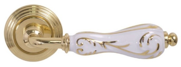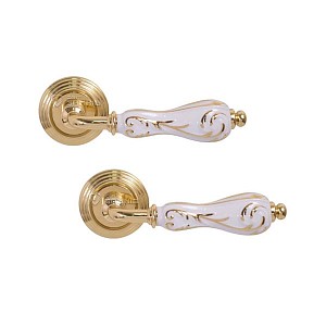 Італійські ручки на розеті популярної торгової марки FIMET. Найкращий вибір для міжкімнатних дверей. Виготовленні з високоякісного латунного сплаву за традиційними італійськими технологіями виробництва. Нажимна частина ручки приємно лягає в руку та зручна у використанні. Завдяки спеціальній двозавитковій пружині ручка не буде провисати. Багатошарове гальванічне покриття забезпечить стійкість кольорового відтінку до стирання та подряпин. Вишукане поєднання – полірована латунь/фарфор з золотом – ідеально доповнить світлий інтер’єр з елементами золота. Ця модель ручок підійде до дверей в класичному стилі і довершить загальну картину інтер'єру.