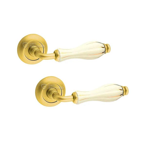 Опис Ручки на розеті FIMET Lady 148 (231C) F02 матова латунь/білий фарфор/золоті смужки