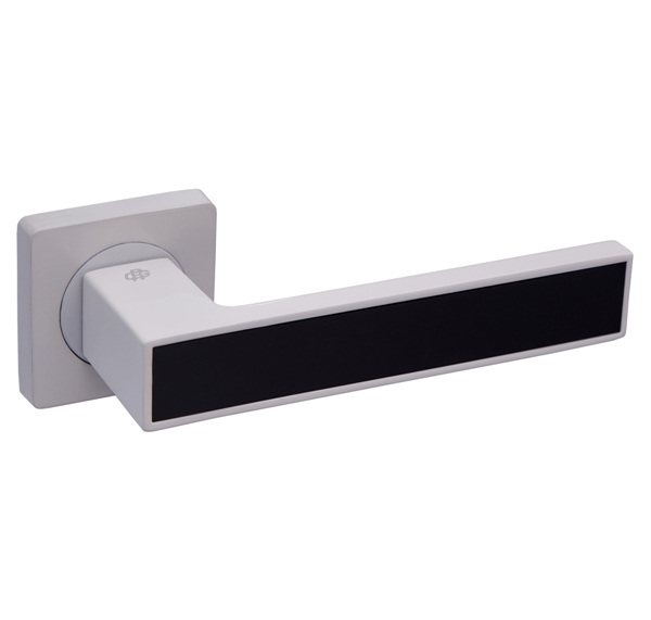 Ручка французької торгової марки GAVROCHE – це поєднання сучасного дизайну та якості за прийнятну ціну. Дана модель виготовлена із алюмінієвого сплаву. Кольоровий відтінок наноситься спеціальним методом – гальваніки. Це гарантує термін служби покриття протягом 36 місяців. Зручна форма нажимної частини зробить користування приємним. Сучасна модель ручки на квадратній розеті довершить дверне полотно з прямими лініями. Біла розета і нажимна основа лаконічно поєднується із чорною вставкою. Рекомендуємо зупинити вибір саме на цій моделі, якщо у Вас біле дверне полотно з чорним склом. Ідеально довершить стиль хай-тек. В ручках такого типу не видно отворів для кріплення, вони прикриваються зовнішньою кришкою розети. Ручка просто і легко монтується. Залежно від встановленого замка та товщини дверей, ручку можна зафіксувати на стяжні гвинти або саморізи.