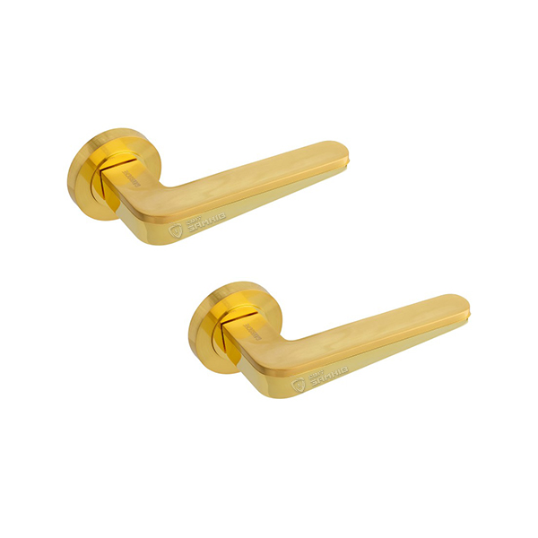 Комплект роздільних ручок французької ТМ "GAVROCHE" - відмінна якість і довговічність роботи. Ручки суцільнолиті, важкі, виготовлені із цинкового сплаву. Кольоровий відтінок наноситься спеціальним методом – гальваніки. Це гарантує термін служби покриття протягом 60 місяців - офіційна гарантія виробника. Зручна форма нажимної частини зробить користування приємним. Кругла основа ручки гарно виглядатиме на полотнах із плавними вигнутими лініями. Кольоровий відтінок золото матове доповнюється яскравим блискучим золотом і робить дану модель довершиною. Гарно виглядає на полотнах в кольорі золотий дуб, венге. Саме цю модель вибирають поціновувачі класики. В ручках такого типу не видно отворів для кріплення, вони прикриваються зовнішньою кришкою розети. Ручка просто і легко монтується. Залежно від встановленого замка та товщини дверей, ручку можна зафіксувати на стяжні гвинти або саморізи.