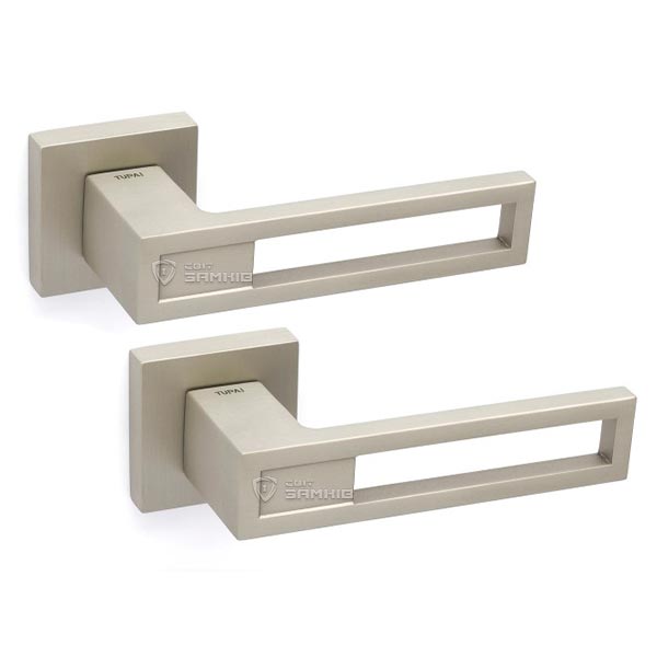 Ручки на розеті португальського виробництва TUPAI. Дверна фурнітура зроблена з урахуванням екологічних європейських стандартів. Матеріал виготовлення – цинк-алюмінієвий сплав. Нажимна частина має подвійну металеву пружину, завдяки чому ручка не буде провисати. Популярний колір – нікель матовий – чудово буде виглядати в кімнаті або офісному приміщені в ніжних світлих відтінках. Покриття наноситься спеціальним методом гальваніки у декілька шарів. Завдяки цьому ручки виглядатимуть як нові до 24 місяців. Додатково це забезпечує стійкість кольору до пошкодження та подряпин. Оригінальний дизайн в стилі хай-тек чудово доповнить дверне полотно з гострими лініями.