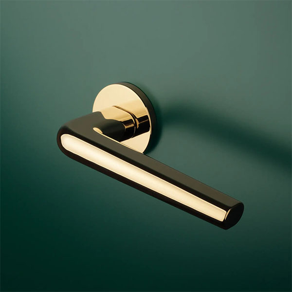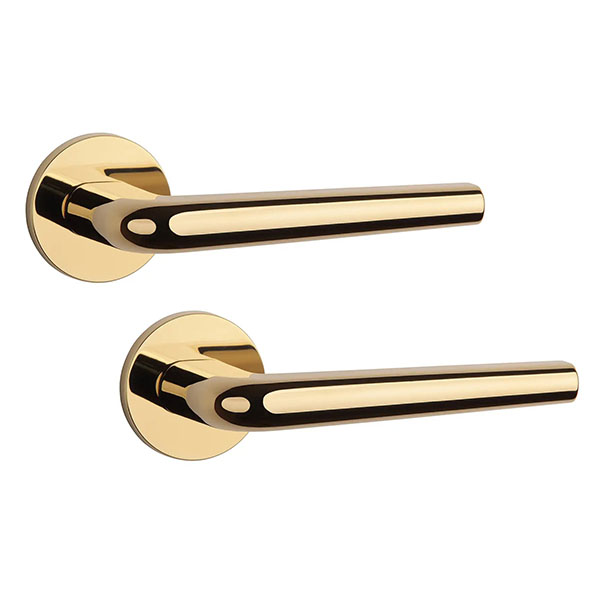 APRILE AT Funkia R 7S – це ручки на круглій розеті. Виготовляються із цинкового сплаву ZAMAK. Завдяки цьому є достатньо міцними. Сучасний дизайн в модерновому стилі з прямими лініями в трендовому кольорі “латунь полірована PVD” відмінно завершить продуманий стиль ваших дверей в подібних золотих відтінках.