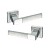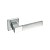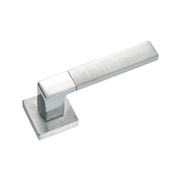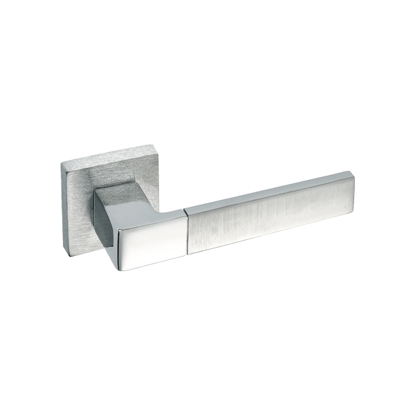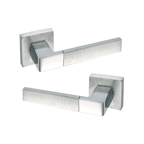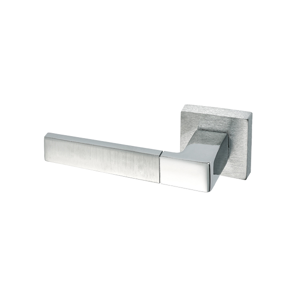Особливістю даної моделі є поєднання двох кольорів. Комбінація глянцевого та матового хрому відразу привертає до себе увагу додаючи певної родзинки й особливості. Ручки з двома відтінками будуть гармонійно виглядати на дверному полотні у будь-якому інтер’єрі аналогічних відтінків. Прямі чіткі лінії нажимної частини та квадратної тонкої розети візуально доповнять та завершать композицію в стилі хай-тек та мінімалізма.