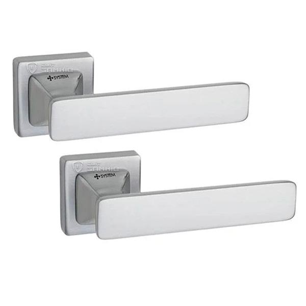Ручки на розеті турецького виробництва SYSTEM. Виготовляються із міцного цинкового сплаву. Ці ручки суцільнолиті та масивні, завдяки чому вони не зламаються. Надійний металевий пружинний механізм забезпечує зручність натискання та відсутність проблем з провисанням ручки. Популярний колір – матовий хром – чудово буде виглядати в приміщені чи кімнаті в сірих тонах. В результаті багатошарового гальванічного покриття, зовнішній вигляд ручки буде збережено до 60 місяців. Такі ручки універсальні – встановлюються як на праві так і на ліві двері. Дизайн розроблений в сучасному стилі хай-тек, ідеальний вибір для дверного полотна з прямими лініями, вставками прямокутного скла.