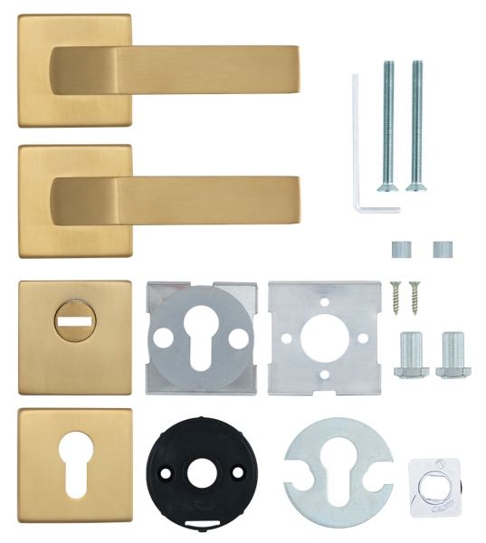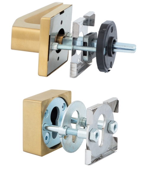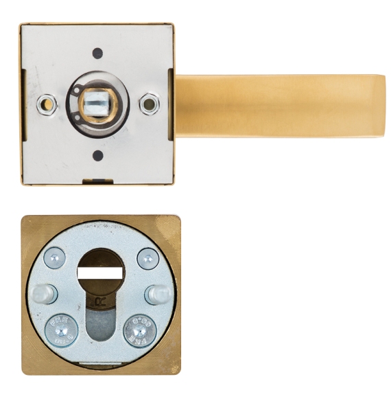 Чеські ручки на квадратній розеті з протектором ROSTEX спеціалісти відносять до захисної дверної фурнітури 3-го класу безпеки. Виражається це в надійній конструкції, яка забезпечує захист серцевини від вандальних видів взлому, зокрема від висверлювання/перелому навпіл, вибивання і т.д. Матеріал виготовлення - нержавіюча сталь, що дає можливість їх використання при різних погодних умовах. Дизайн в золотому матовому кольорі підійде для дверей в приміщеннях з класичним дизайном в темних або кремових тонах з помірною кількістю орнаменту. Встановлюються на вхідні металеві та дерев’яні двері товщиною від 38 до 45мм. Якщо двері товстіші, то додатково обираються подовжуючі набори. Для монтажу використовуються стяжні гвинти, для яких потрібно щоб в замку були наскрізні отвори. Відзначаються довговічністю та тривалим часом роботи.