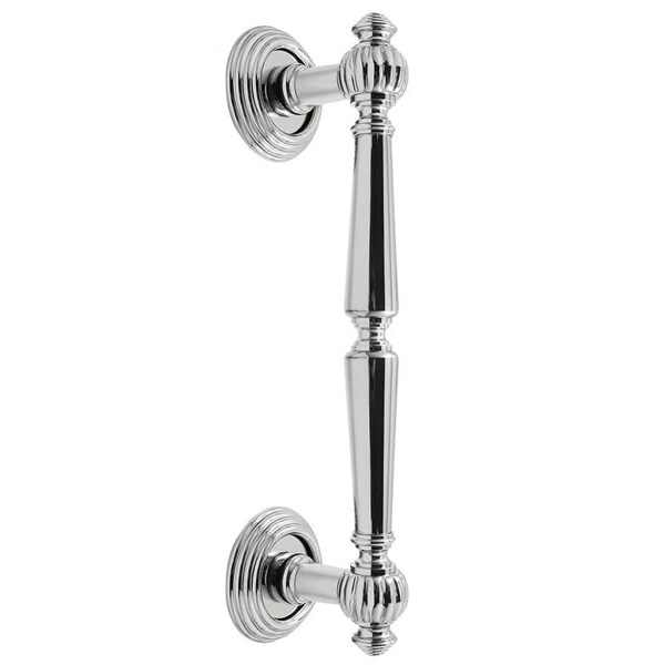 Італійська ручка скоба торгової марки FIMET. В розробці цієї моделі дизайнерам вдалося поєднати витончений стиль ручок та їх неперевершену якість. Ручки такого типу не мають механічних частин, тому їхній термін експлуатації значно більший, ніж у звичайних нажимних. Матеріал виготовлення – латунь, його переваги в тому, що він міцний та приємний на дотик. Ергономічна форма ручки зручно лягає в долоню і викликає тільки приємні емоції після користування. Популярний колір – хром – чудово підійде для інтер’єру з яскравими світлими відтінками. Вишуканий класичний дизайн ідеальний вибір для дверного полотна з різноманітними візерунками та орнаментами. Основним технічним критерієм при виборі є довжина ручки та відстань між кріпленнями. Важливо щоб при встановленні скоби, кріплення розмістились вище та нижче замка. Через дверне полотно робиться наскрізний отвір, куди вставляється спеціальна шпилька з різьбою. На неї накручується ручка і фіксується гужонами на нижній і верхній розеті. Або ручку можна закрутити на шурупи, які прикриваються зовнішньою розетою.