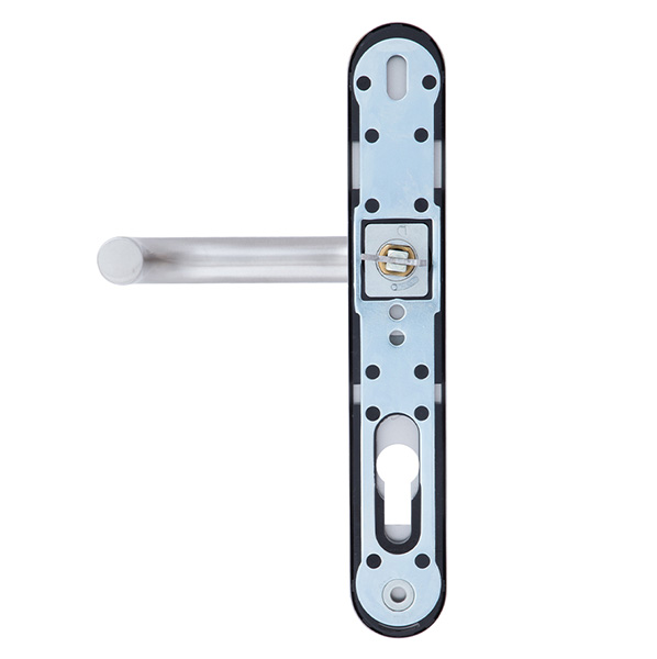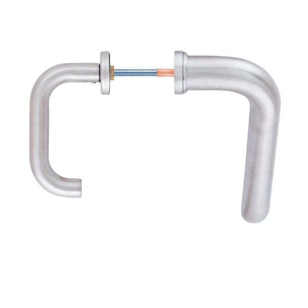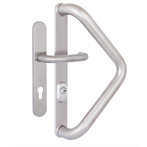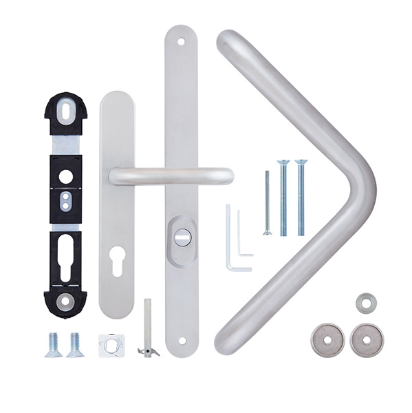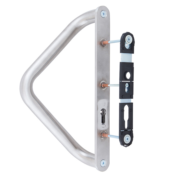 Ручки скоби чеської торгової марки ROSTEX. Призначені для використання на вхідних дерев’яних та металевих дверях. Виготовляються із нержавіючої сталі. Це міцний матеріал, який не боїться навантажень та стійкий до корозії. Дана модель поєднує в собі два різних типи ручок. З одного боку це нажимна ручка на планці, яка посилена металевою пластиною. А з іншого фіксована скоба. Таке поєднання чудово підійде для офісних приміщень чи для приватних будинків, де використовують електромоторний замок. Додатково на скобі є протектор із гартованої сталі, який забезпечить надійний захист Вашої серцевини від висвердлювання та виламування. Основним технічним критерієм при виборі такої ручки є її довжина, відстань між кріпленнями та міжосьова відстань. Ця модель підходить лише для механізму замка з міжосьовою відстанню 85 мм. Процес кріплення здійснюється за рахунок наскрізних отворів, куди вставляється спеціальні стяжні гвинти М6х75мм. Далі ці гвинти зсередини через ручку на планці вкручуються в скобу, завдяки чому гарантують надійну фіксацію до дверного полотна.
