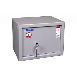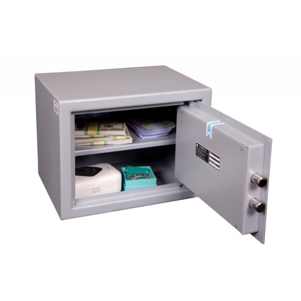 Корпус і двері сейфа виготовлені із металу завтовшки 1,5 і 2 мм відповідно. Закривається ключовим сувальдним замком. Замикання здійснюється обертовими ригелями діаметром 16 мм. Вони забезпечать практичний захист від можливості їх перепилювання. В сірому кольорі відмінно доповнить будь-яке сучасне приміщення.