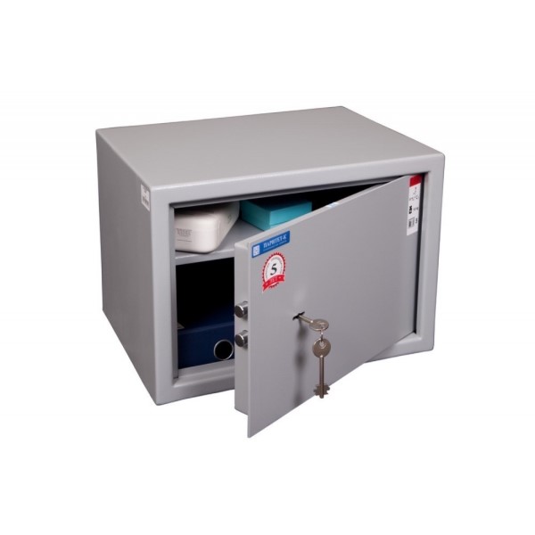 Корпус і двері сейфа виготовлені із металу завтовшки 2 і 3 мм відповідно. Закривається ключовим сувальдним замком. Замикання здійснюється обертовими ригелями діаметром 16 мм. Вони забезпечать практичний захист від можливості їх перепилювання. В сірому кольорі відмінно доповнить будь-яке сучасне приміщення.
