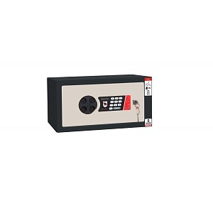 Корпус і двері сейфа виготовлені із металу завтовшки 3 мм. Закривається електронним кодовим замком GRIFFON. Особливістю цієї моделі є наявність ключового замка англійського типу. Він виступає в ролі аварійного і застосовується лише для відкривання в тому випадку, якщо Ви забули код до електронного замка або не хочете його вводити. Замикання здійснюється товстими обертовими ригелями діаметром 25 мм. Вони забезпечать практичний захист від можливості їх перепилювання. Петлі мають внутрішнє виконання. Вони дозволяють відкрити двері сейфа на 90 градусів, не перекриваючи при цьому сам отвір. В поєднанні антрацитово-сірого з кремово-білим кольором відмінно доповнить будь-яке сучасне приміщення.
