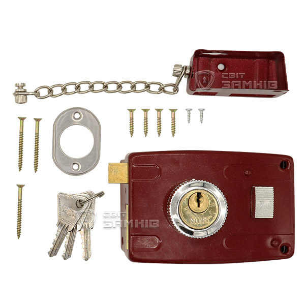 Додатковий накладний замок китайського виробництва. Призначений для використання на вхідний дерев’яних та металевих дверях в будинок, дачу, квартиру тощо. Механізм закривання складає серцевина з англійським ключем. Додатково в цьому замку присутній язичок. На корпусі замка також є спеціальний важіль, за допомогою якого можна перевести язичок на автоматичне або не автоматичне закривання. Також в комплекті є дверний ланцюг, який дає змогу повністю не відкривати двері і, наприклад, залишати їх на провітрюванні приміщення.