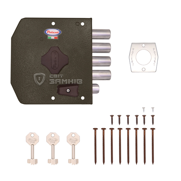 POTENT 435 – це 4-ригельний італійський замок. Встановлюється НАКЛАДНИМ способом на дверне полотно. Використовується на вхідних дерев’яних та металевих дверях квартири чи будинку. Також його часто обирають для монтажу в гаражах чи складських приміщеннях, де встановити врізний замок немає можливості або це не доцільно.