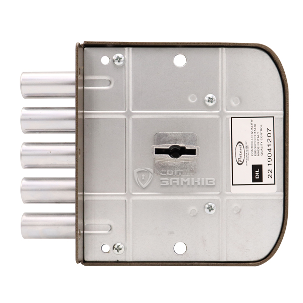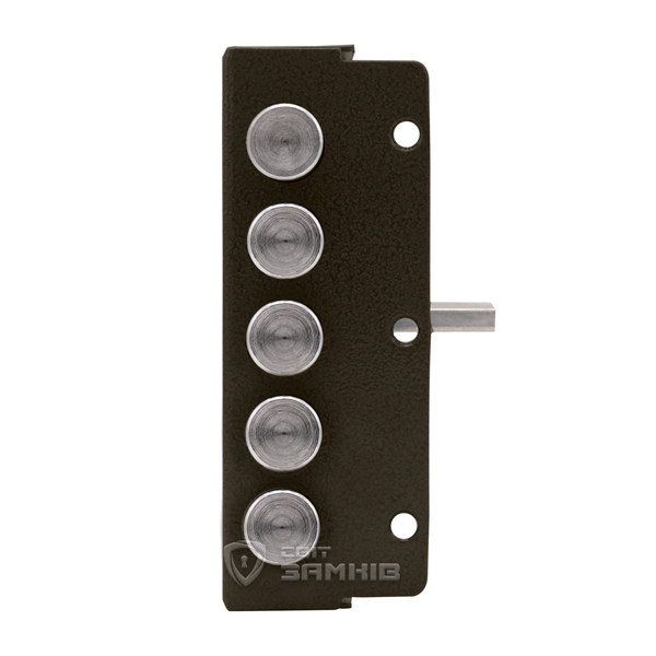 Дана модель призначена для дверей ЛІВОГО відкривання. Замок керується сувальдним механізмом. Він приводить в дію 5 круглих стальних ригелів діаметром 18 мм. Повний вихід ригелів на 32 мм відбувається за 4 оборота ключа. Завдяки 6-м підпружиненим сувальдам досягається секретність замка в 50 000 можливих комбінацій. Це робить можливість підбору ключа малоймовірним. Зворотня планка входить в комплект.