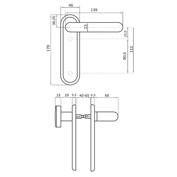 Міжосьова відстань складає 72 мм. Це основний критерій в процесі вибору такого типу дверних ручок. Планка ручки кріпиться до дверного полотна стяжними гвинтами.