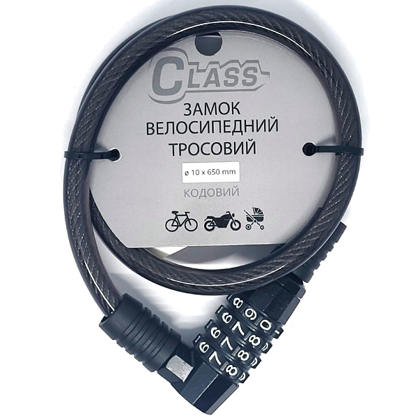CLASS COD-650 MBP – це надійний навісний замок для велосипеда. За конструкцією це трос довжиною 65 см з товщиною 10 мм. Виготовлений із загартованої сталі.