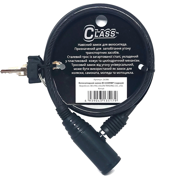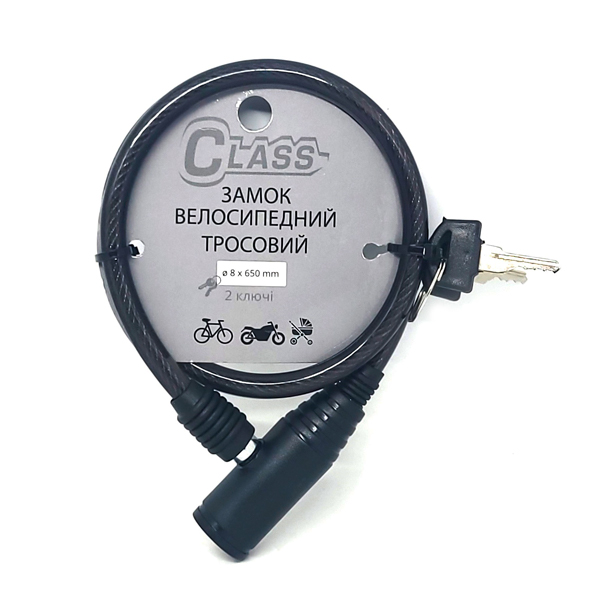CLASS ВЗ-650 MBP – це надійний навісний замок для велосипеда. За конструкцією це трос довжиною 65 см з товщиною 8 мм. Виготовлений із загартованої сталі. Для того, щоб не пошкодити Ваш велосипед та захистити його від подряпин, він спеціально покритий ПВХ чохлом.