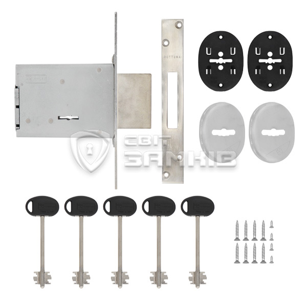 Універсальний корпус MOTTURA з серії 40 встановлюється на вхідні дерев’яні і металеві двері в якості додаткового замка. Механізм легкий в установці як на правосторонні так і на лівосторонні двері. Має одну точку замикання у вигляді масивного ригеля. Для закривання потрібно зробити чотири напівоберти ключем.