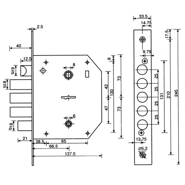 • Вихід ригеля нічної засувки — 21 мм.