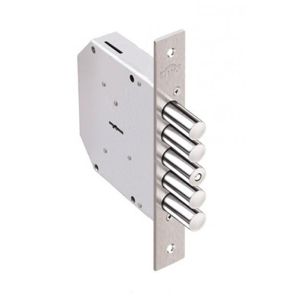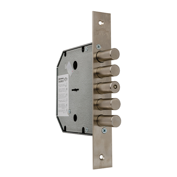 Встановлюють такий замок переважно на двері товщиною від 40 до 80 мм. Через його розміри встановити на двері із меншою товщиною неможливо. П'ять круглих ригелів із виходом 40мм забезпечать надійний захист дверей від віджиму, а загартована вставка в ригелі захистить їх від перепилювання.
