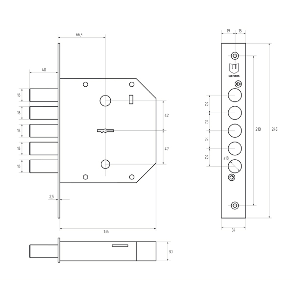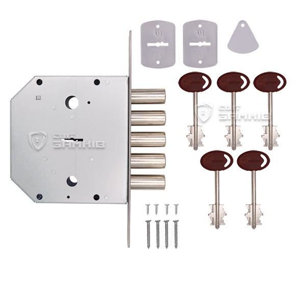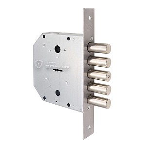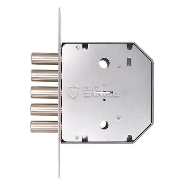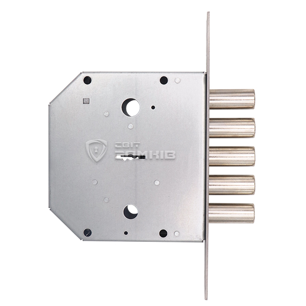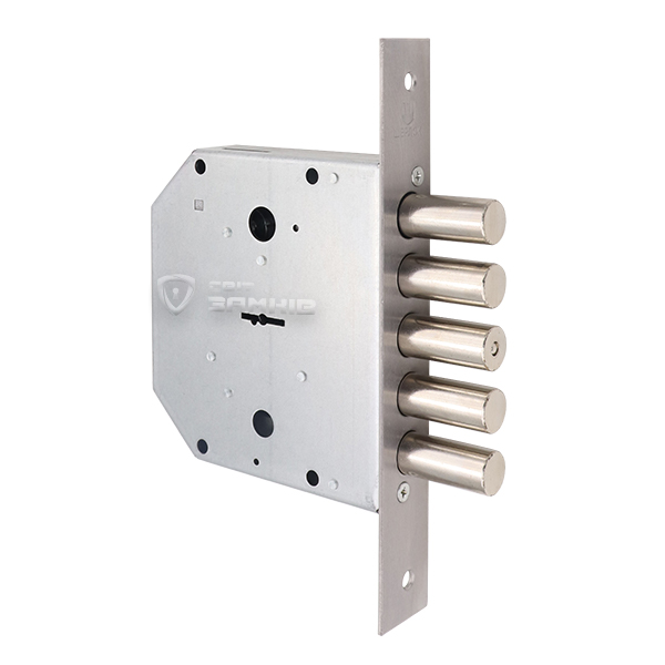 Підходить для правих і лівих дверей, так як язичок реверсивний. Після провертання ключа замикання відбувається 5-ма ригелями діаметром 18 мм з повним виходом 40 мм. В комплекті 5 ключів.