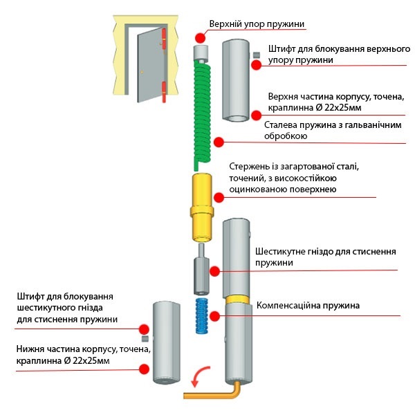 • Пружина виконує функцію дотягування дверей.