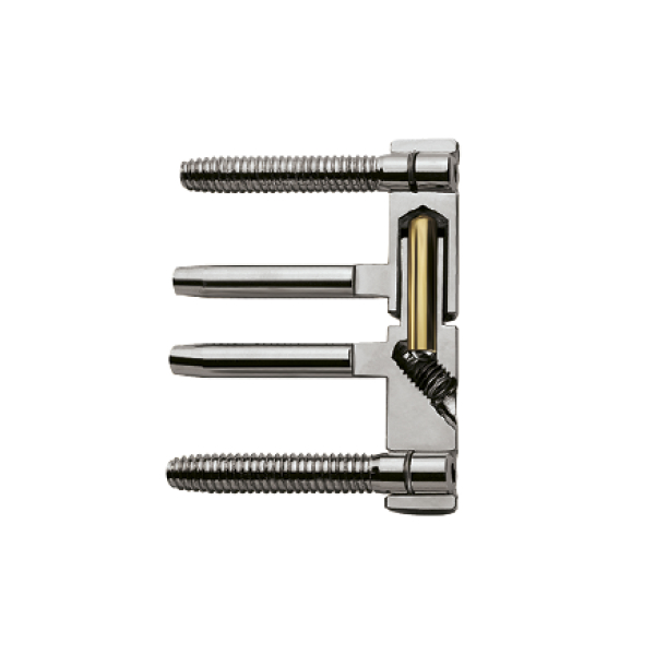 Завіс торгової марки AGB 3D D-16. Ця модель призначена для дверного полотна, яке має не прямий торець дверей, а виступ приблизно 1/3 від конструкції. Такі завіси складаються з двох частин, і кожна частина має по два стержні. Один стержень призначений для центрування, а інший для регулювання полотна по горизонталі. Тому у випадку просідання дверного полотна його можна буде відрегулювати. Під час вибору важливо врахувати вагу та габарити Ваших дверей, щоб визначитись із кількістю потрібних петель. Покриття наноситься методом гальваніки, що гарантує стійкість кольорового відтінку до стирання та подряпин. Завіси монтуються з використанням спеціального шаблону за рахунок закручування стержнів у дверну раму.