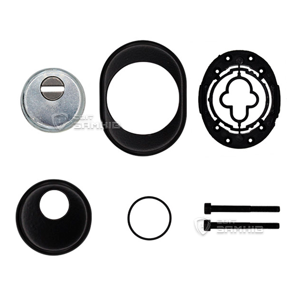 Для монтажа по его диаметру делается отверстие в дверном полотне. Крепится вокруг сердцевины стяжными винтами, создавая монолитную конструкцию с ней. Таким образом, протектор защищает ее вместе с точкой крепления в дверях от физических и силовых методов взлома - сверления, взлома и выбивания. Доступа к винтам крепления нет и сорвать саму броненакладку чрезвычайно сложно. Высота (или толщина) ее составляет 25/33/42 мм, диаметр - 50 мм. В черном цвете лучше будет дополнять двери аналогичных оттенков для того, чтобы максимально избежать контрастов и не привлекать лишнего внимания.