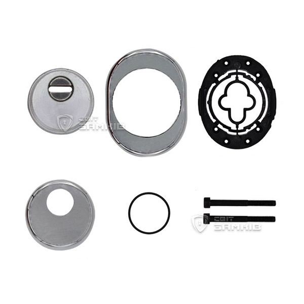 Для монтажа по диаметру протектора делается отверстие в дверном полотне. Крепится вокруг сердцевины стяжными винтами, создавая монолитную конструкцию с ней. Таким образом, протектор защищает ее вместе с точкой крепления в дверях от физических и силовых методов взлома - сверления, взлома и выбивания. Доступа к винтам крепления нет и сорвать саму броненакладку чрезвычайно сложно. Высота (или толщина) ее составляет 25/33 мм, диаметр - 50 мм. В цвете "хром" лучше будет дополнять двери светлых оттенков - от тепло-серых до бежевых.
