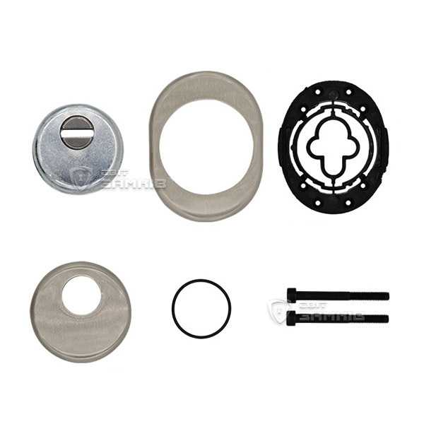 Для монтажа по диаметру протектора делается отверстие в дверном полотне. Крепится вокруг сердцевины стяжными винтами, создавая монолитную конструкцию с ней. Таким образом, протектор защищает ее вместе с точкой крепления в дверях от физических и силовых методов взлома - сверления, взлома и выбивания. Доступа к винтам крепления нет и сорвать саму броненакладку чрезвычайно сложно. Высота (или толщина) ее составляет 25/33 мм, диаметр - 50 мм. В цвете "никель сатин" лучше будет дополнять двери светлых оттенков - от тепло-серых до бежевых.