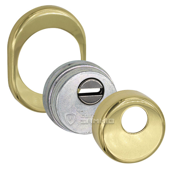 Для монтажа по диаметру протектора делается отверстие в дверном полотне. Крепится вокруг сердцевины стяжными винтами, создавая монолитную конструкцию с ней. Таким образом, протектор защищает ее вместе с точкой крепления в дверях от физических и силовых методов взлома - сверления, взлома и выбивания. Доступа к винтам крепления нет и сорвать саму броненакладку чрезвычайно сложно. Высота (или толщина) ее составляет 25/33 мм, диаметр - 50 мм. В цвете "полированная латунь" лучше будет дополнять двери светлых оттенков.