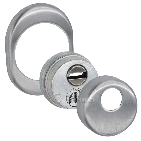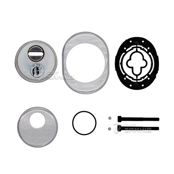 Для монтажа по диаметру протектора делается отверстие в дверном полотне. Крепится вокруг сердцевины стяжными винтами, создавая монолитную конструкцию с ней. Таким образом, протектор защищает ее вместе с точкой крепления в дверях от физических и силовых методов взлома - сверления, взлома и выбивания. Доступа к винтам крепления нет и сорвать саму броненакладку чрезвычайно сложно. Высота (или толщина) ее составляет 25 мм, диаметр - 50 мм. В цвете "матовый хром" лучше будет дополнять двери светлых оттенков - от тепло-серых до бежевых.