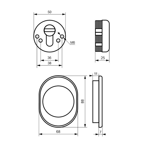 Монтируется врезным методом: по его диаметру делается отверстие в дверном полотне. Крепится сквозь вокруг сердцевины стяжными винтами М6 с технологией Flex. Ее суть заключается в более мелкой резьбе и определенной насечке. Благодаря этому и специальному виду жесткой стали винты выдерживают нагрузку в 5 раз больше, чем обычные. Так они создают монолитную конструкцию с сердцевиной. Таким образом, протектор защищает ее вместе с точкой крепления в дверях от физических и силовых методов взлома - сверления, взлома и выбивания. Доступа к винтам крепления нет и сорвать саму броненакладку чрезвычайно сложно. Также вкручивается во внешнюю "юбку" и фиксируется гужоном. Дополнительной защиты от сверления дают установленные в отверстия крепления закаленные шарики. Высота (или толщина) протектора составляет 25 мм, диаметр - 50 мм. Монтируется на двери с помощью пластика и саморезов. В черном хромированном цвете лучше будет дополнять двери аналогичных оттенков для того, чтобы максимально избежать контрастов и не привлекать лишнего внимания.