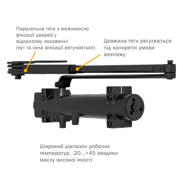 В данной комплектации присутствует параллельная тяга с фиксацией дверного полотна в открытом положении. Это дает возможность сохранить дизайн помещения там, где нужно, чтобы доводчик не выделялся или вообще была возможной его установка в условиях ограниченного пространства. Фиксация же позволит оставить двери открытыми для проветривания или для удобства пользования в коммерческих помещениях.