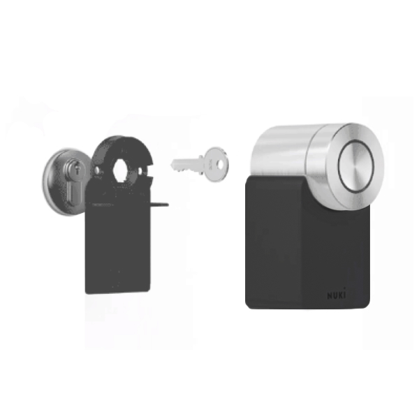 Ключ-ключ: обязательное требование к сердцевине – оно должно работать в режиме “антипаника” (управление доступно извне, даже если ключ вставлен внутри). В цилиндр вставляется активный ключ, на который монтируется специальный кронштейн. После этого устанавливается замок Nuki Smart Lock 3.0 Pro.