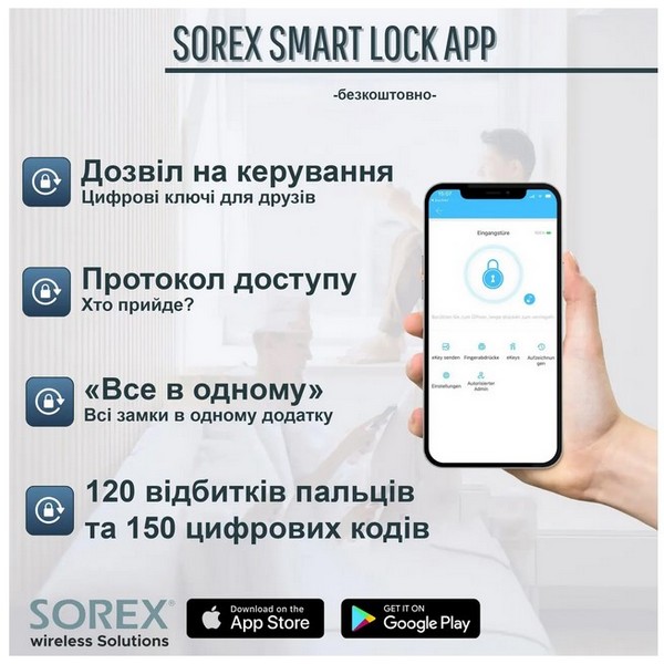Простіше кажучи, PES Patron це накладний смарт-замок, який встановлюється накладним монтажем з внутрішньої та зовнішньої сторони дверей на врізну механічну частину замка. Має сенсорну панель для введення пароля, датчик для зчитування відбитка пальця та режим “Не турбувати” з внутрішньої частини замка. Відкрити двері з даним смарт-замком можна за допомогою: відбитка пальця, пароля, брелка або NFC мітки, RFID-карти, смартфона із застосунком Sorex Smart Lock. Відмикання механічним ключем також можливе – у нижній частині планки для цього є ключовий отвір. Проте даний спосіб використовують найчастіше для екстреного відкриття.