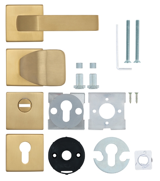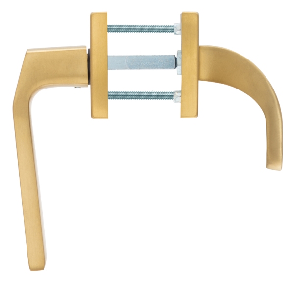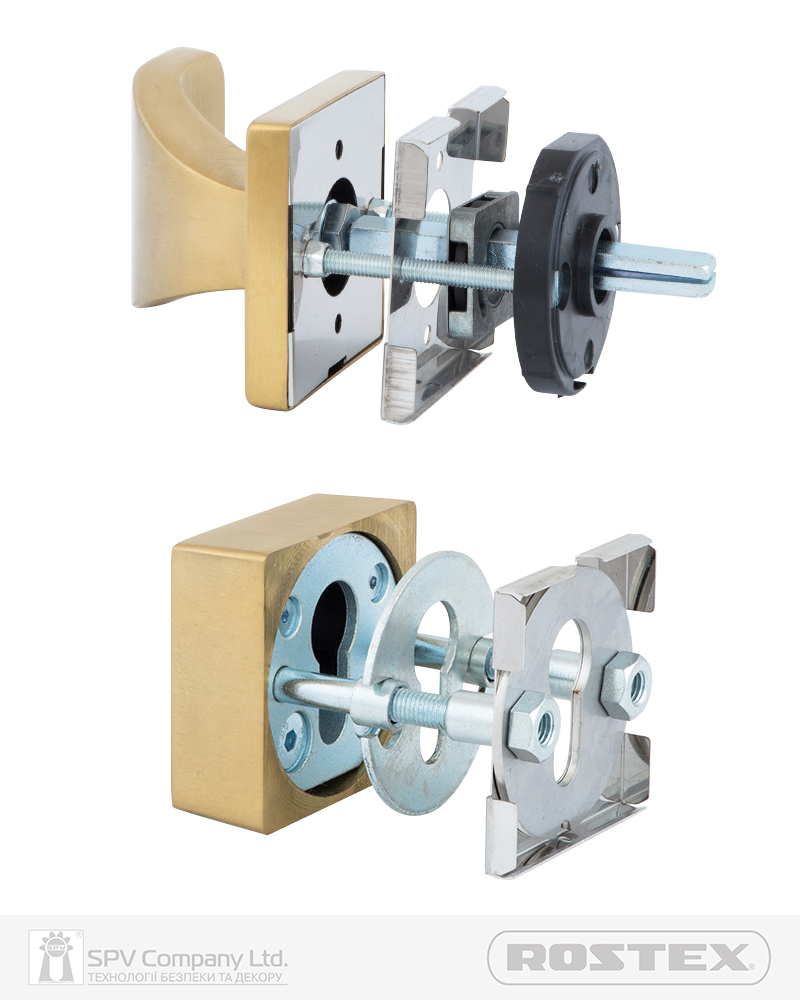 Чешские ручки на квадратной розетте с протектором ROSTEX специалисты относят к защитной дверной фурнитуры 3-го класса безопасности. Выражается это в надежной конструкции, которая обеспечивает защиту сердцевины от вандальных видов взлома, в частности от высверливания/перелома пополам, выбивания и т.д. Материал изготовления - нержавеющая сталь, что дает возможность их использования при различных погодных условиях. Дизайн в золотом матовом цвете подойдет для дверей в помещениях с классическим дизайном в темных или кремовых тонах с умеренным количеством орнамента. Устанавливаются на входные металлические и деревянные двери толщиной от 38 до 45мм. Если дверь толще, то дополнительно покупаются удлиняющие наборы. Для монтажа используются стяжные винты, для которых нужно чтобы в замке были сквозные отверстия. Изнутри двери открываются нажимной ручкой, снаружи - фиксированной. Отмечаются долговечностью и длительным временем работы.
