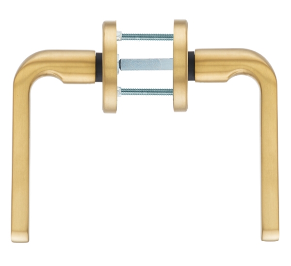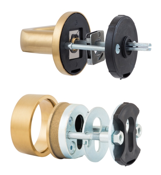 Чешские ручки на круглой розетте с протектором ROSTEX специалисты относят к защитной дверной фурнитуры 3-го класса безопасности. Выражается это в надежной конструкции, которая обеспечивает защиту сердцевины от вандальных видов взлома, в частности от высверливания/перелома пополам, выбивания и т.д. Материал изготовления - нержавеющая сталь, что дает возможность их использования при различных погодных условиях. Дизайн в золотом матовом цвете подойдет для дверей в помещениях с классическим дизайном в темных или кремовых тонах с умеренным количеством орнамента. Устанавливаются на входные металлические и деревянные двери толщиной от 38 до 45мм. Если дверь толще, то дополнительно избираются удлиняющие наборы. Для монтажа используются стяжные винты, для которых нужно чтобы в замке были сквозные отверстия. Отмечаются долговечностью и длительным временем работы.