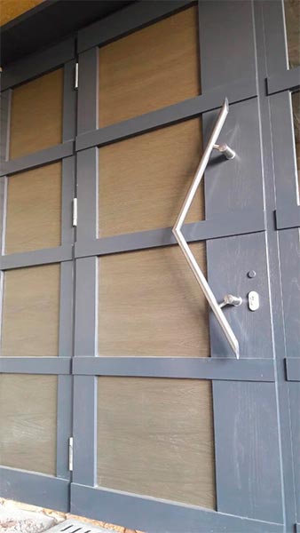 При внутреннем креплении внешняя ручка-скоба фиксируется внутри помещения. Во внешнюю скобу вставляется специальная шпилька с резьбой или стержень и намертво фиксируется. Далее через дверное полотно делается сквозное отверстие куда вставляется крепление с ручкой-скобой. С середины монтируется другая половинка ручки или накручиваются гайки-фиксаторы, которые не дают возможности снять наружную ручку.