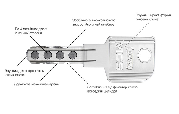 А также ключ с четырьмя магнитами уникальной полярности и восемью магнитами в цилиндре.