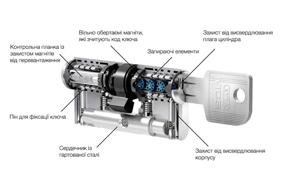 Также используется 7 механических слайдерных элементов, которые считывают боковую нарезку на ключе, они обеспечивают еще большую безопасность и гарантию того, что цилиндр не будет открыт.