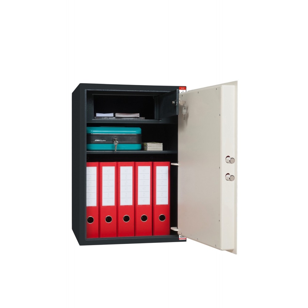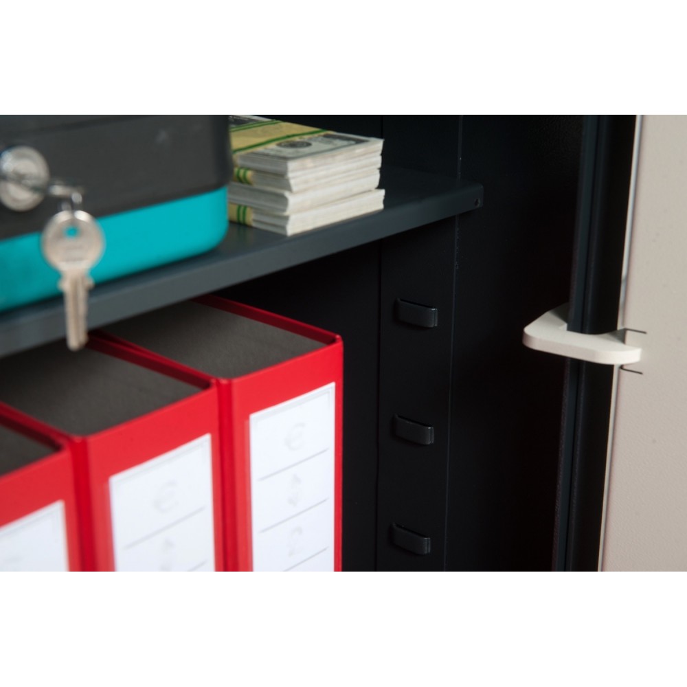 Корпус и двери сейфа изготовлены из металла толщиной 3 мм. Вместе с ключевым сувальдным замком это создаст преграду для злоумышленника. Запирание осуществляется вращающимися ригелями диаметром 16 мм. Они обеспечат практическую защиту от возможности их перепиливания. В сочетании антрацитово-серого с кремово-белым цветом отлично дополнит любое современное помещение.