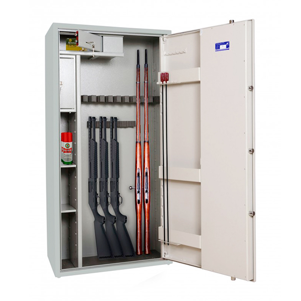 Внутреннее пространство имеет размеры: 1494 мм по высоте, 444 мм по ширине и 293 мм по глубине. Он включает передвижной ложемент под оружие с оптикой и съемный магнитный ложемент, который устанавливается на любую удобную высоту. Есть 3 полки. Их можно легко снять, если будет необходимость хранить объемные предметы. Кроме того, на дверях присутствуют съемные навесные элементы, которые переставляются: карманы для магазинов под патроны и средства по уходу за оружием, держатели для шомполов (2-4 ед.), крючки. Дополнительно в этой модели есть 2 отдельных кассовых отдела (трейзеры), которые можно использовать для хранения патронов. Они закрываются на ключ.