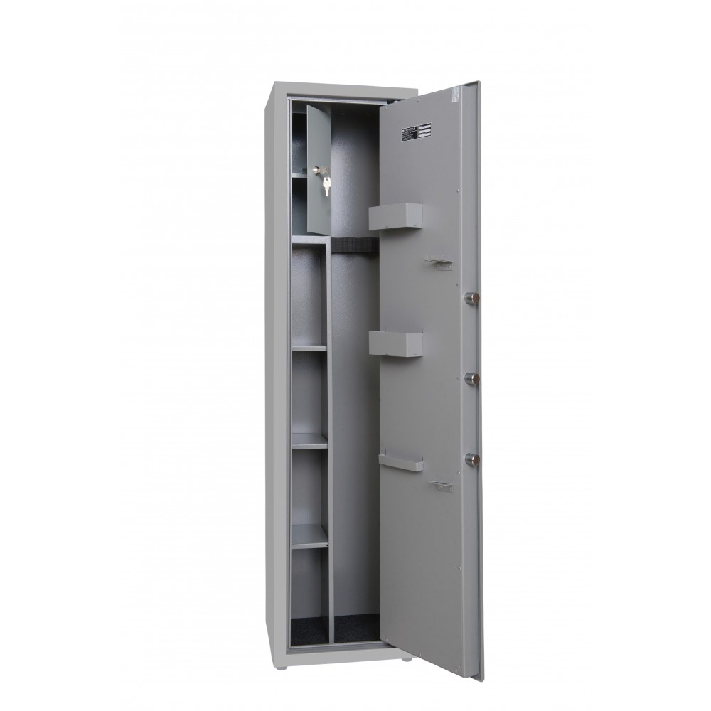 Внутреннее пространство имеет размеры: 1397 мм по высоте, 347 мм по ширине и 238 мм по глубине. Он включает передвижной магнитный ложемент под оружие. Есть 3 полки. Их можно легко снять, если будет необходимость хранить объемные предметы. Кроме того, на дверях присутствуют съемные переставляемые навесные элементы: карманы для магазинов под патроны и средства по уходу за оружием, держатели для шомполов. Дополнительно в этой модели есть отдельный кассовый отдел (трейзер), который можно использовать для хранения патронов. Он закрывается на ключ.