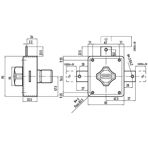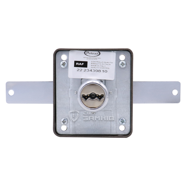 POTENT 1025 – это итальянский замок с проушинами, предназначенными для управления тягами и девиаторами. Устанавливается накладным способом на дверное полотно в случаях, когда не хватает длины ригелей.
