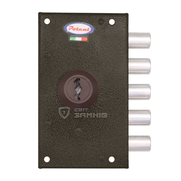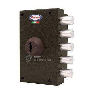 POTENT 1705 – это 5-ригельный итальянский замок с узким корпусом. Устанавливается накладным способом на дверное полотно. Используется на входной деревянной и металлической двери квартиры или дома. Также его часто выбирают для монтажа в гаражах или складских помещениях, где установить врезной замок нет возможности или это нецелесообразно.