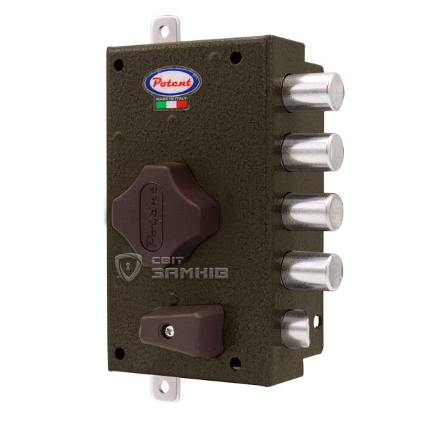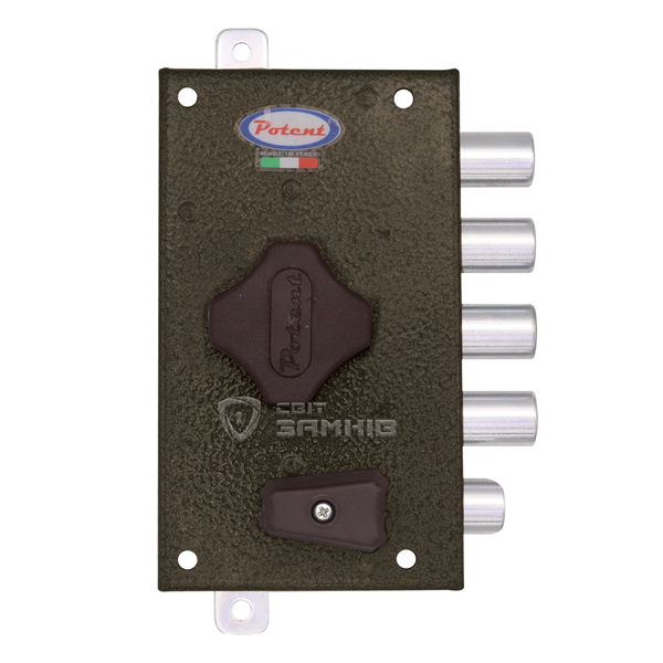 POTENT 1730 – это 4-ригельный итальянский замок с узким корпусом. Устанавливается накладным способом на дверное полотно. Используется на входной деревянной и металлической двери квартиры или дома. Также его часто выбирают для монтажа в гаражах или складских помещениях, где установить врезной замок нет возможности или это нецелесообразно.